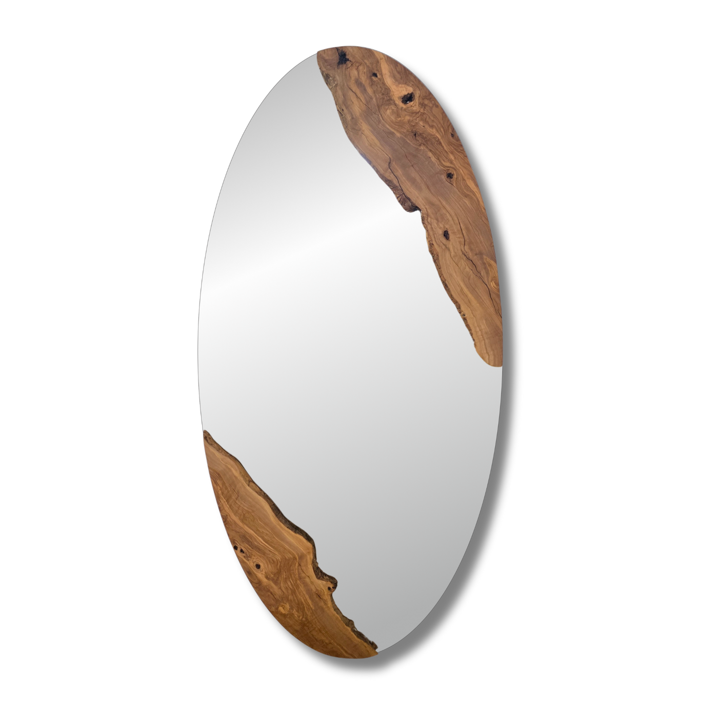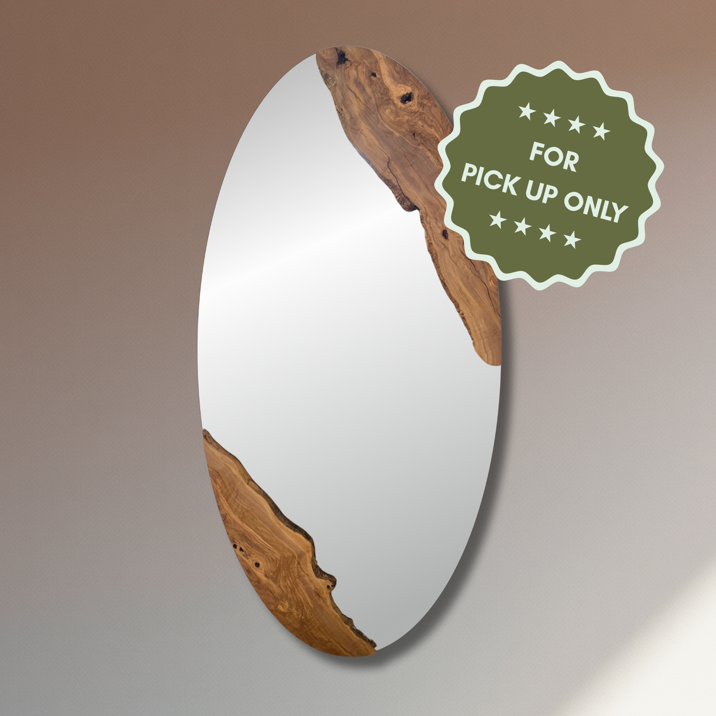 Transform your space with our large Olive Live Edge Oval Mirror. This stunning masterpiece showcases the natural beauty of local olive wood with its distinctive live edge design. Each mirror is completely unique, highlighting the wood's individual character and grain patterns. Ready to hang with included hardware, this eye-catching piece adds warmth and organic elegance to any room. Perfect for creating a statement in homes, vacation rentals, or boutique hotels!